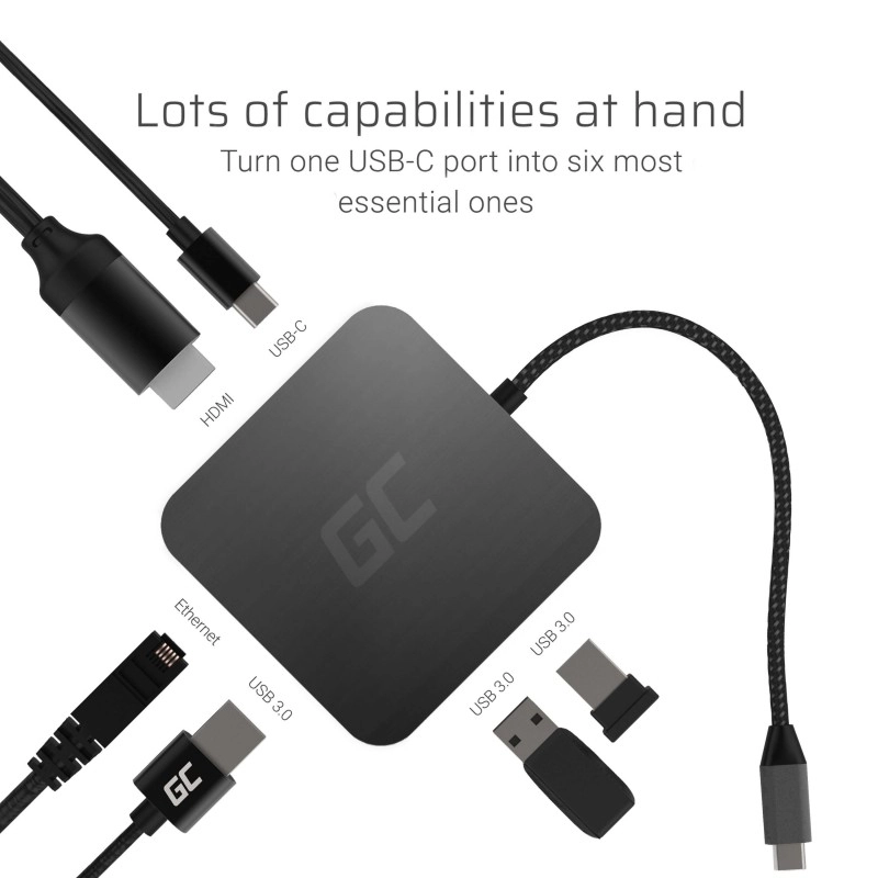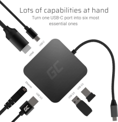 Maksimalizirajte povezivost jednim rješenjem. GREEN CELL 6u1 dodaje sve što trebate: brze podatke preko USB 3.0, stabilnu mrežu zahvaljujući Gigabit Ethernetu, oštru sliku s HDMI do 4K i istovremeno punjenje putem USB‑C Power Delivery do 87 W. Savršeno pristaje ultrabookovima kao što su APPLE MacBook, DELL XPS, ASUS ZenBook, LENOVO ThinkPad i drugi s USB‑C sučeljem.