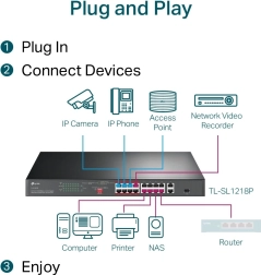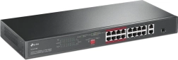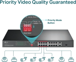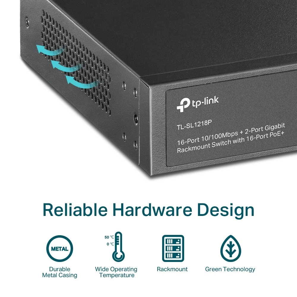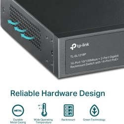 TP-Link TL-SL1218P je pouzdan rackmount switch za IP kamere, pristupne točke i VoIP telefone. Pruža 16 portova 10/100 Mb/s s PoE+ prema 802.3af/at, dva gigabitna uplink RJ45 porta i jedan combo gigabitni SFP za fleksibilno povezivanje na mrežnu okosnicu. Napajalački budžet od 150 W omogućuje bezbrižno napajanje više uređaja istovremeno.