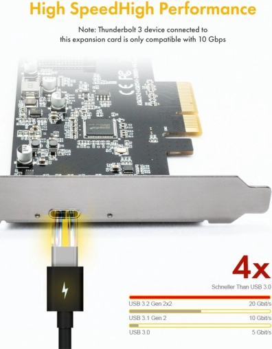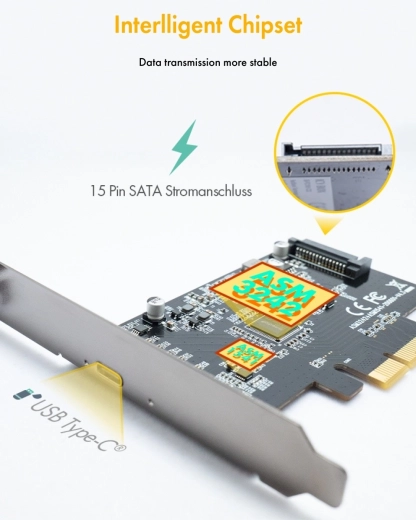 Zahvaljujući podršci za PCI Express 3.0 (x4) i kompatibilnosti s utorima x4/x8/x16 osigurava stabilnu i brzu vezu. Integrirane plave LED diode označavaju napajanje i aktivnu vezu, pa uvijek imate nadzor nad stanjem uređaja. Kartica se temelji na provjerenim kontrolerima Asmedia ASM1541 i ASM3242 za maksimalnu kompatibilnost i performanse.
