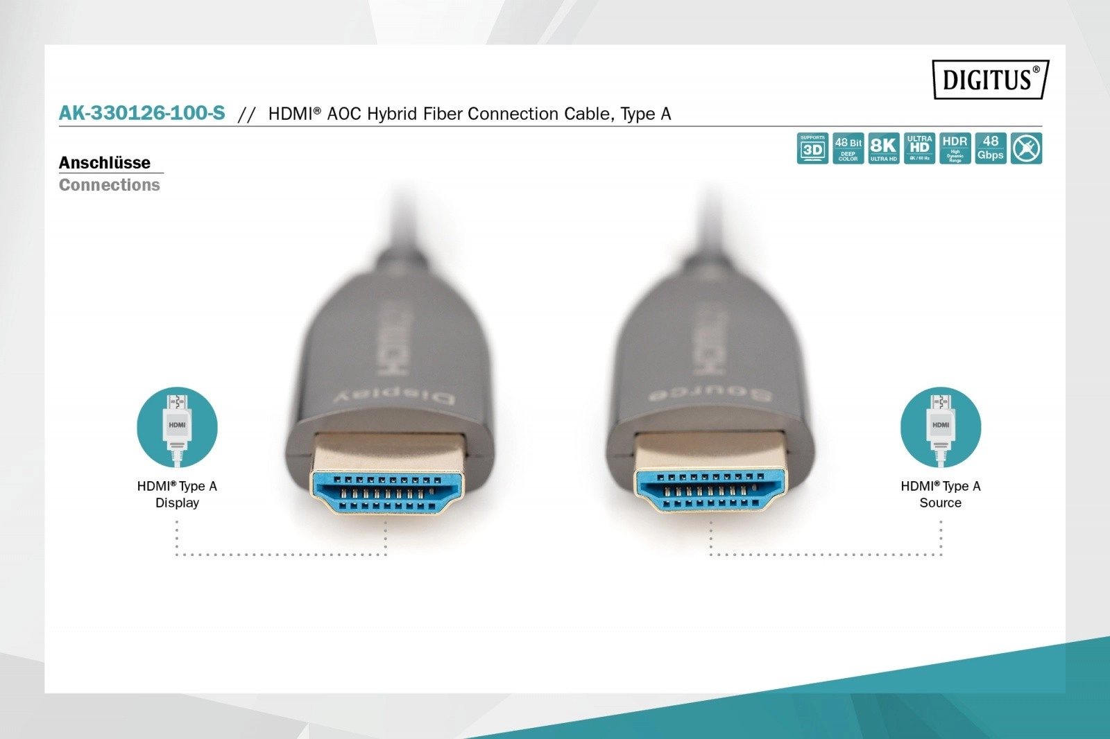 Aktivni hibridni HDMI AOC kabel idealan je za prijenos nekomprimirane slike i zvuka na velike udaljenosti. Hibridna konstrukcija od bakrenih i optičkih vlakana jamči besprijekornu kvalitetu prijenosa s razlučivošću do 8K/60Hz i propusnošću 48 Gb/s.