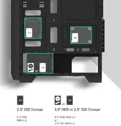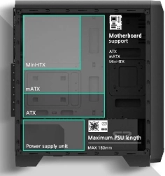 Ovo moderno PC kućište spaja čist dizajn s promišljenom funkcionalnošću. Bočna stranica od 4 mm kaljenog stakla pruža panoramski pogled na komponente, a lak pristup osiguravaju ručni vijci. Zahvaljujući prostranoj unutrašnjosti, lako ćete ugraditi snažne grafičke kartice i visoke hladnjake procesora.