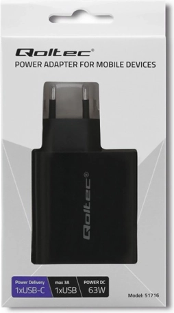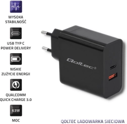 Qoltec punjač opremljen je najnovijom tehnologijom Power Delivery, koja se prilagođava priključenom uređaju i postavlja optimalni napon i struju. Zahvaljujući USB-C priključku nudi univerzalnost i snagu od 63W. S tehnologijom QUALCOMM QUICK CHARGE značajno skraćuje vrijeme punjenja u odnosu na standardne punjače.