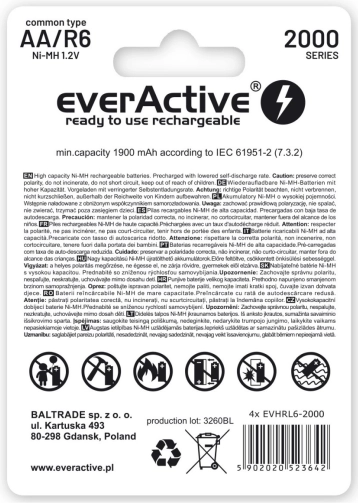 Set od četiri punjive AA baterije s kapacitetom 2000 mAh u tehnologiji ready to use za trenutačnu upotrebu. Idealne za fotoaparate, bljeskalice, svjetiljke i prijenosne reproduktore. Nude učinak usporediv s alkalnim baterijama, ali se mogu puniti do 1200× i bolje podnose visoke struje pražnjenja.