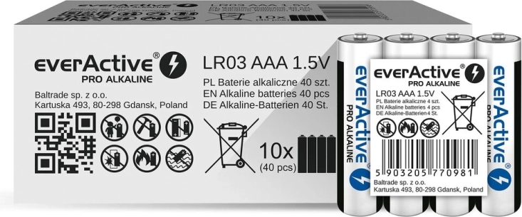 Alkalne baterije everActive Pro Alkaline veličine AAA (LR03) idealan su izbor za uređaje koji zahtijevaju pouzdan i dugotrajan izvor energije. Zahvaljujući kapacitetu od oko 1250 mAh pružaju konzistentne performanse i izvrsnu izdržljivost u daljinskim upravljačima, bežičnim miševima, igračkama, svjetiljkama i drugim uređajima.