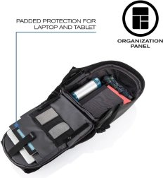 - Organizacija: podstavljene komore za prijenosno računalo i tablet, mrežasti džepovi, pregledan panel