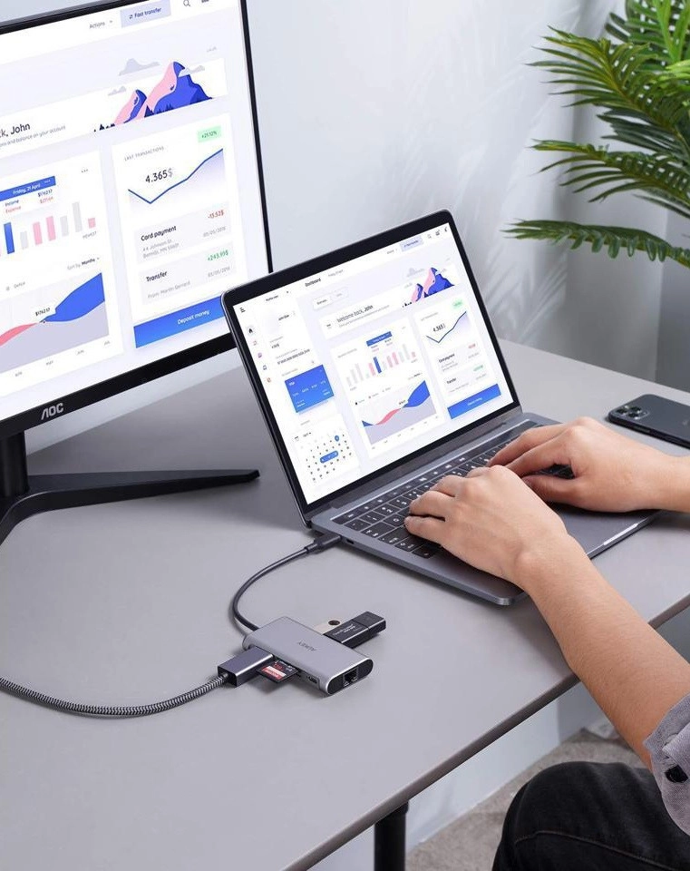 Hub Aukey CB-C91 USB-C zapravo je razdjelnik 8-u-1. Dovoljno ga je priključiti na jedan USB priključak i dobit ćete čak OSAM ulaza koji su nužni za svakodnevni rad. Opremljen je s tri USB 3.0 priključka, USB-C Power Deliveryjem, HDMI priključkom, Ethernet priključkom te dvama utorima za kartice. Više vam neće nedostajati slobodnih USB utora; od sada ćete moći priključiti sve uređaje koji su vam potrebni, i još više.