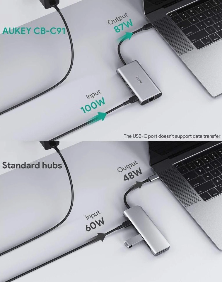 Aukey CB-C91 omogućuje brzinu prijenosa podataka od 5 Gb/s, a zahvaljujući HDMI sučelju slanje rezolucije do 4K @ 30 Hz na povezani zaslon neće predstavljati nikakav problem. Gigabitni Ethernet priključak dodatno podržava mrežne brzine do 1.000 Mb/s. Također bez problema možete puniti svoje omiljene uređaje. Zahvaljujući tehnologiji Power Delivery vaše se prijenosno računalo može napajati snagom od 100 W, čak i dok koristite druge funkcije razdjelnika. Punjenje nikada nije bilo tako brzo; na tako visoki standard rada zasigurno ćete se naviknuti od prvog dana, a Aukey CB-C91 postat će vam neprocjenjiva (i nezamjenjiva!) podrška.