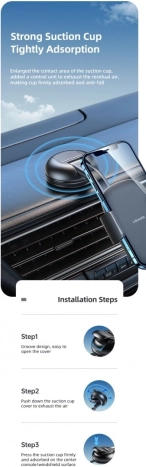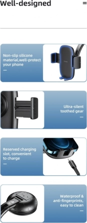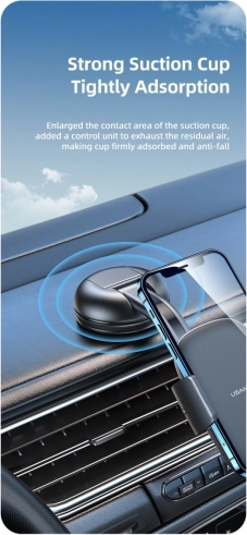 Držač je opremljen teleskopskom rukom i stabilnom vakuumskom čašicom, što jamči čvrsto pričvršćivanje i sigurnost telefona. Zahvaljujući protukliznoj silikonskoj površini štiti vaš telefon od ogrebotina i oštećenja. Držač se jednostavno montira na kontrolnu ploču ili vjetrobransko staklo, što pruža fleksibilnost pri postavljanju i udobno korištenje.