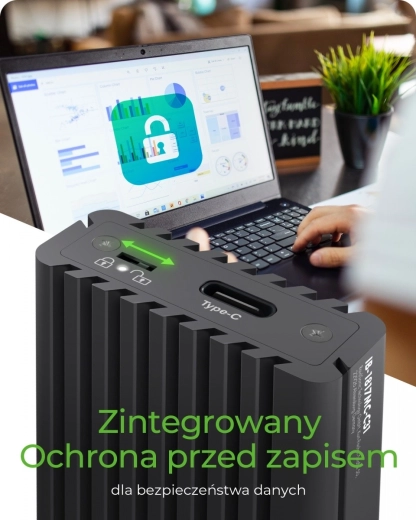 Precizno obrađeno aluminijsko kućište s rebrima zajedno s unutarnjim hladnjakom i termalnom podlogom učinkovito odvodi toplinu za stabilne performanse bez throttlinga. Praktični prekidač zaštite od pisanja štiti vaše podatke, a LED dioda jasno signalizira rad i pristup disku. U pakiranju su kabeli za USB‑C i USB‑A, pa ste spremni za svaki priključak.