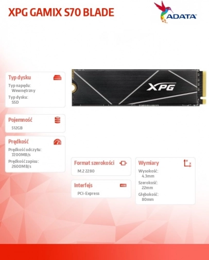 Ultrabrzi interni NVMe disk XPG GAMMIX S70 BLADE s sučeljem PCIe 4.0 x4 nudi performanse do 7,2/2,6 GB/s, a kompaktni format M.2 2280 i aluminijski hladnjak snižavaju temperature do 20 %. Zahvaljujući tehnologijama LDPC ECC, E2E zaštiti podataka, RAID Engine i AES-256 dobivate brzinu, pouzdanost i sigurnost.