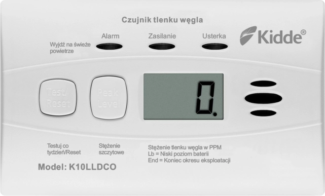 Detektor ugljičnog monoksida Kidde K10LLDCO s ugrađenim LCD zaslonom prikazuje koncentraciju CO u rasponu od 0 do 999 ppm. Zahvaljujući napajanju iz ugrađene baterije detektor je moguće instalirati na optimalno mjesto neovisno o mrežnom naponu.