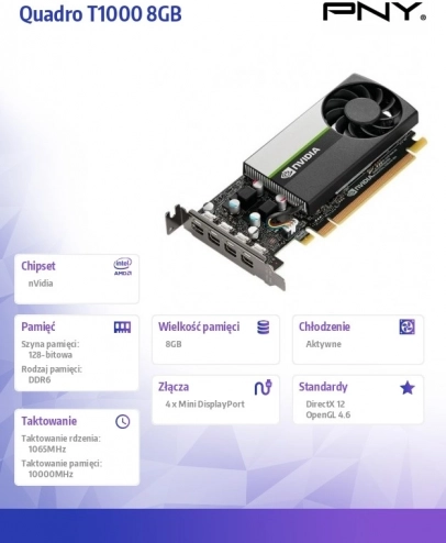 Grafička kartica PNY Quadro T1000 dizajnirana je za profesionalce u području 3D modeliranja i renderiranja. Visoke performanse i fleksibilnost omogućuju nesmetan rad i s velikim skupovima podataka zahvaljujući 8 GB GDDR6 memorije i propusnosti od 160 GB/s.