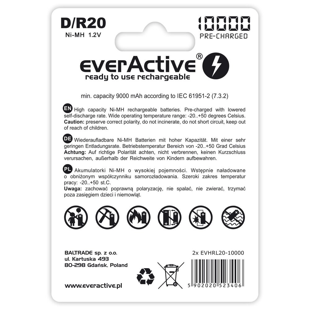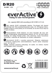 Punjaive baterije everActive R20/D 10000 mAh idealne su za profesionalnu upotrebu. Zahvaljujući tehnologiji 'spremno za uporabu' izvrstan su nadomjestak za alkalne baterije i pogodne za uređaje kao što su svjetiljke i igračke.