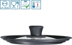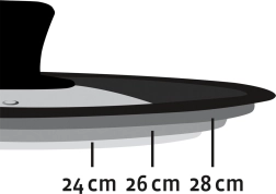 Univerzalni poklopac je praktično rješenje ako vam nedostaje poklopac za određeno posuđe. Jedan poklopac može zamijeniti čak tri različita poklopca promjera 24, 26 ili 28 cm. Zahvaljujući prozirnom dizajnu možete lako pratiti pripremu hrane.