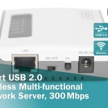 S višeportnim bežičnim USB poslužiteljem 2.0 marke DIGITUS možete jednostavno upravljati USB uređajima preko mreže bez potrebe za povezivanjem s PC-jem ili prijenosnikom. Poslužitelj pruža brzinu do 300 Mbps i omogućuje bežično povezivanje svih USB uređaja u mreži.