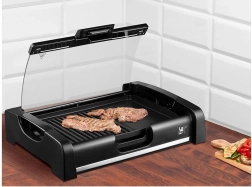 Grill ploča s neprianjajućom površinom je odvojiva, što omogućuje lako čišćenje čak i pri čestom korištenju. Stakleni poklopac štiti okolinu od masnoće.