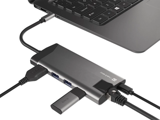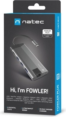 USB‑C razdjelnik NATEC Fowler Plus 8 u 1, 3× USB 3.0, HDMI 4K, RJ‑45, SD/microSD, PD 100 W