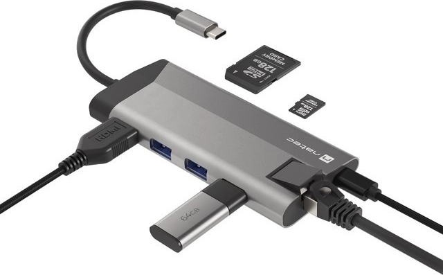 - 8 u 1: USB‑C, 3× USB‑A 3.0, HDMI 1.4, RJ‑45, SD, microSD