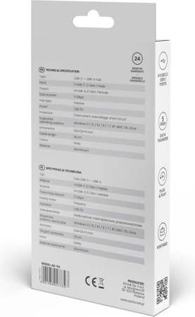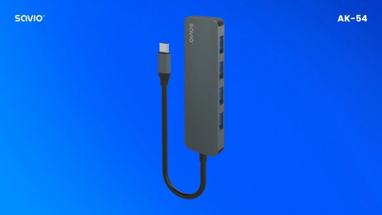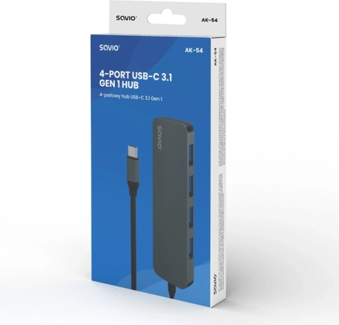Proširite povezivost svog USB‑C uređaja pomoću kompaktnog huba Savio. Četiri USB‑A porta omogućuju istovremeno povezivanje vanjskih diskova, tipkovnica, miševa i druge periferije. Standard USB 3.1 Gen 1 osigurava brz prijenos podataka do 5 Gbps, a uređaj je unatrag kompatibilan sa starijim verzijama USB‑a.