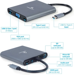 Ovaj kompaktni USB‑C hub 6 u 1 pretvara jedan port vašeg uređaja u bogatu konektorsku opremu. Dobivate oštru sliku preko HDMI‑a s podrškom za 4K @ 30 Hz i VGA u Full HD‑u, povezujete periferije brzinom USB 3.1 Gen 1 (5 Gb/s), slušate preko 3,5 mm stereo izlaza i istovremeno punite prijenosnik zahvaljujući USB‑C Power Delivery 60 W (PD 3.0).