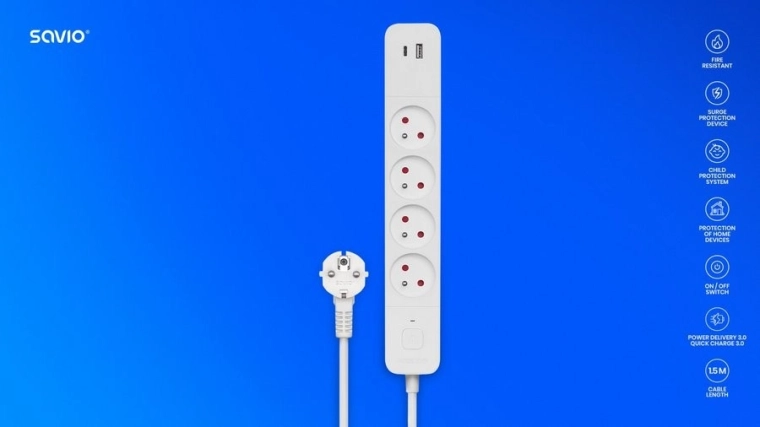 Savio LZ-11 produžni kabel nudi kombinaciju četiri uzemljene utičnice i dva USB priključka (USB-A i USB-C), idealna za brzo punjenje vaših uređaja. Zahvaljujući tehnologijama Quick Charge 3.0 i Power Delivery 3.0 možete brzo puniti mobilne uređaje bez dodatnih punjača.