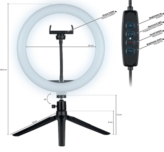 Upravljanje je brzo i intuitivno zahvaljujući pozadinski osvijetljenom upravljaču na USB kabelu, gdje uključite/isključite svjetlo te mijenjate svjetlinu i boju. Držač za telefon smješta se točno u središte prstena za jednoliko osvjetljenje lica. Mini stolni stativ s rotirajućom i podesivom glavom omogućuje precizno namještanje kuta snimanja.