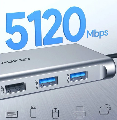 Proširite povezivost svog prijenosnika jednim kabelom. Ovaj aluminijski hub 10-u-1 od AUKEY-ja nudi univerzalni skup portova za monitore, mrežu, pohranu i napajanje. Prenosite podatke brzinom do 5 Gb/s, streamajte 4K video i napajajte uređaje putem USB‑C PD 100 W – sve istovremeno i bez kompromisa.