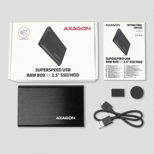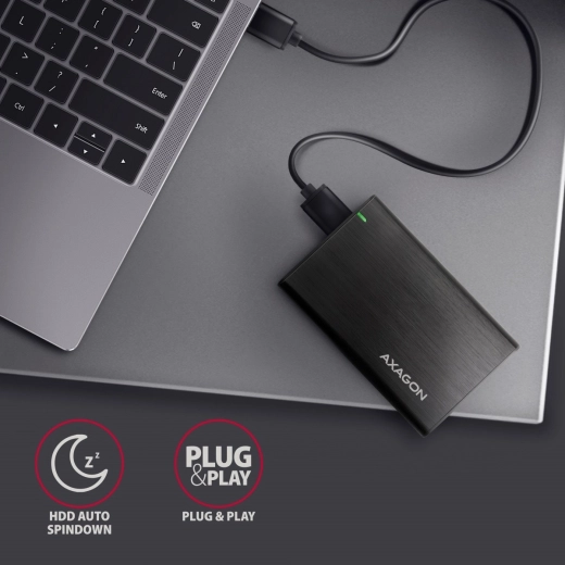Ovo bezvijčano aluminijsko vanjsko kućište AXAGON dizajnirano je za sve 2,5” SATA HDD i SSD diskove. USB Micro-B priključak zajedno s priloženim kabelom osigurava pouzdano povezivanje s računalom.