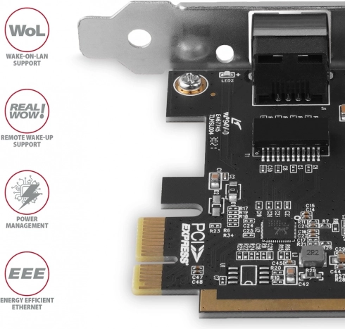 Kartica podržava Plug & Play, hardverska ubrzanja (Checksum Offload, Large Send), Full Duplex s kontrolom toka, VLAN tagging i prioritizaciju prometa (802.1P). Tu je i Auto MDI/MDIX za automatsko prepoznavanje križnih kabela, LED indikacije aktivnosti te moderni Wake‑on‑LAN scenariji za udaljeno buđenje.