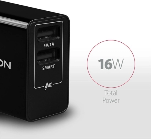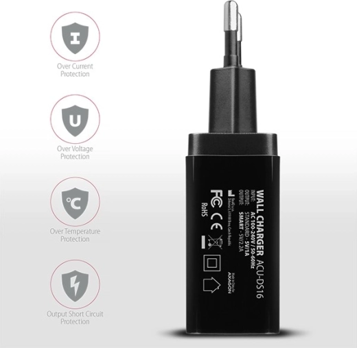 AXAGON ACU-DS16 univerzalni je dualni USB mrežni punjač koji zahvaljujući ukupnoj snazi 16 W pouzdano napaja pametne telefone, tablete, slušalice i ostalu opremu. Dva izlaza 5 V/1 A i SMART 5 V/2,2 A omogućuju brzo i sigurno punjenje jednog ili dvaju uređaja istodobno.