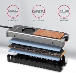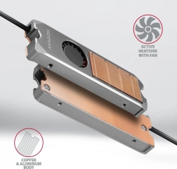 Aktivni hladnjak za SSD M.2 2280 kombinira rebrastu bakrenu jezgru i aluminijski pokrov s tihim ventilatorom upravljanim PWM-om. Priključak na standardni 4-pin header omogućuje automatsku regulaciju prema temperaturi. Zahvaljujući metalnom okviru odvodi toplinu s obje strane diska, maksimizirajući rashladni učinak za NVMe i SATA (AHCI) module.