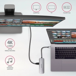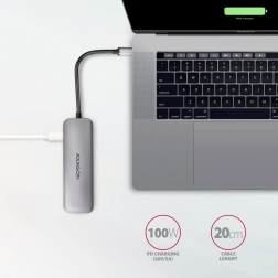 Univerzalni razdjelnik 5u1 pretvara jedan USB-C priključak u više mogućnosti. Povežite vanjske diskove, miš i tipkovnicu, čitajte SD/microSD kartice i istovremeno projicirajte sliku preko HDMI-ja do 4K/30 Hz. Putem USB-C Power Delivery lako napajate prijenosnik do 100 W – tako štedite jedan port i kabel.
