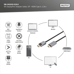 Pouzdan kabel za izravno povezivanje DisplayPort uređaja s HDMI monitorom ili TV-om. Podržava 4K Ultra HD (3840 × 2160) pri 30 Hz, ima pozlaćene kontakte, DP mehanizam za zaključavanje i izdržljivo aluminijsko kućište s najlonskim opletenim omotačem za dug vijek trajanja bez smetnji.