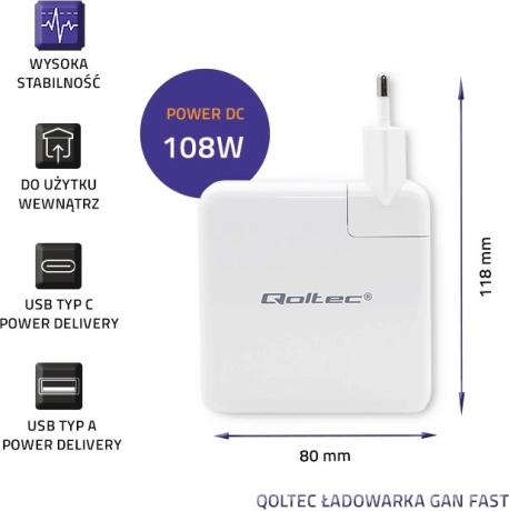 Punjač Qoltec GaN FAST 108W predstavlja revoluciju u tehnologiji punjenja zahvaljujući inovativnoj primjeni poluvodičkog materijala GaN. Ova tehnologija osigurava da je punjač ne samo snažan i brz, već i lakši od tradicionalnih modela.