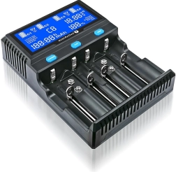 Univerzalni punjač s iznimno širokom kompatibilnošću za ćelije Li‑ion, Li‑HV, LiFePO4 i Ni‑MH. Podržava veličine AA, AAA, C, D, 9V te Li‑ion ćelije od 10440 do 33600, uključujući 20700/21700 sa zaštitom. Zahvaljujući maksimalnoj duljini kliznih vodilica od 76 mm lako ćete puniti i dulje akumulatore.