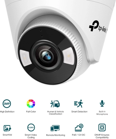 VIGI C430 je kompaktna turret kamera dizajnirana za pouzdan 24/7 nadzor u živim bojama. Zahvaljujući 3MP razlučivosti hvata fine detalje, dok osjetljivi senzor i točkasto LED dosvjetljenje osiguravaju kolornu sliku i u potpunom mraku. Kodek H.265+ štedi prostor za pohranu i propusnost bez vidljivog gubitka kvalitete.