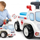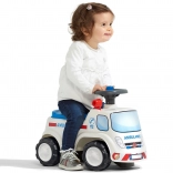 Stilska guralica u izgledu vozila hitne pomoći potiče dječju maštu i razvoj ravnoteže. Zahvaljujući volanu s trubom djeca uče bolje koordinirati pokrete, dok široki kotači i stabilna konstrukcija pružaju sigurnost pri prvim vožnjama.