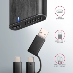 Kućište AXAGON opremljeno je modernim USB‑C konektorom za pouzdano povezivanje i isporučuje se s kabelom USB‑C -> USB‑C te adapterom USB‑C -> USB‑A. Tako ga možete lako povezati s prijenosnikom, računalom ili čak mobilnim uređajem.