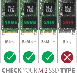 Bezvijčana konstrukcija od crnog aluminija s ventilacijom osigurava optimalno hlađenje i produljuje vijek trajanja diska. Prikladno je za sve veličine M.2 SSD diskova: 2242, 2260 i 2280 mm. Ovaj je proizvod odličan izbor za one koji traže stilsko i učinkovito rješenje za pohranu i prijenos podataka.