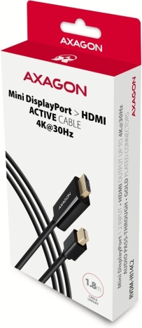 Aktivni kabel AXAGON Mini DisplayPort → HDMI kombinira pretvarač i povezni kabel u jedno rješenje. Dovoljno je priključiti i odmah prenositi sliku i zvuk na HDMI uređaje. Podržava razlučivost do 4096 × 2160 pri 30 Hz, što osigurava oštru sliku i fluidne prezentacije ili video u 4K.