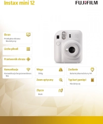 Fujifilm Instax Mini 12 idealan je suputnik za izlete, proslave i svakodnevne trenutke. Zahvaljujući trenutnom ispisu dobit ćete fizičke fotografije u nekoliko sekundi, i to bez kompliciranih postavki. Minimalistički dizajn i mala masa čine ga stilskim i praktičnim uređajem za svaku torbu.