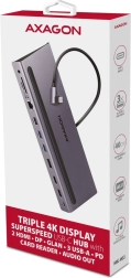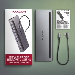 Moćni hub Axagon HMC-4KX3 omogućuje priključivanje tri monitora istodobno, svaki s razlučivošću do 4K/30Hz. Zahvaljujući podršci za HDR, uživajte u širem spektru boja i kontrasta. Sučelje USB 3.2 Gen 1 omogućava brzi prijenos podataka do 5Gb/s, što osigurava učinkovitu rad s datotekama.