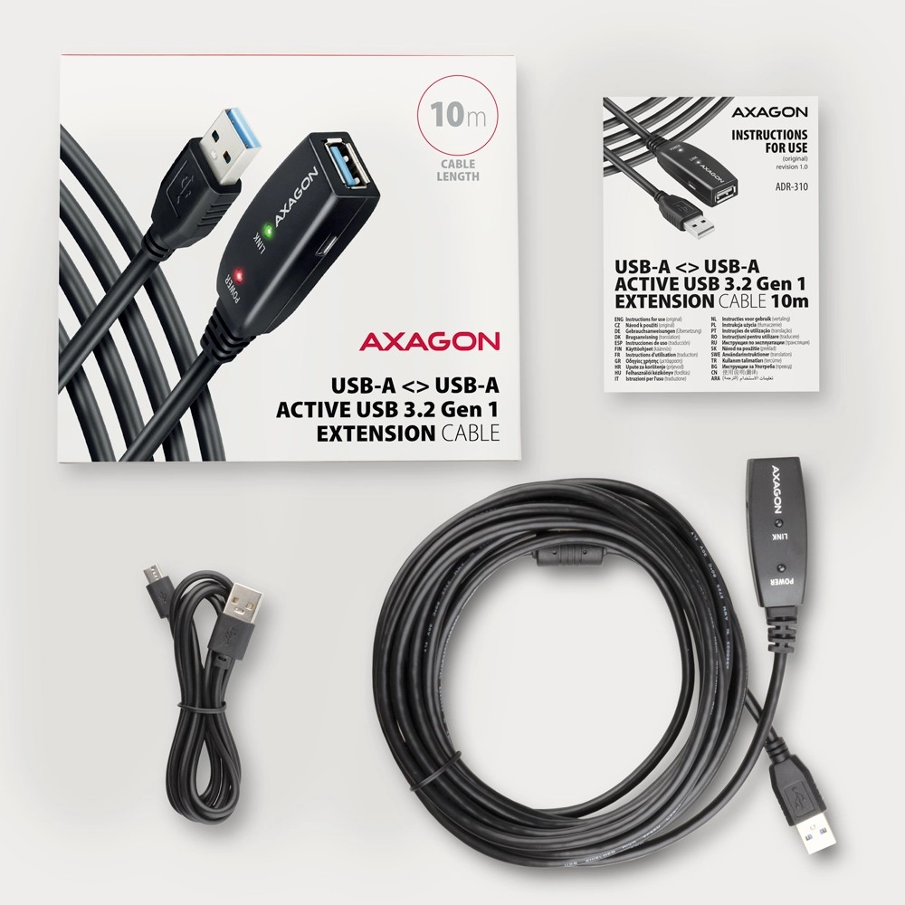 Aktivni produžni USB kabel AXAGON ADR-310 opremljen je sučeljem USB 3.2 Gen 1 za višu brzinu prijenosa podataka, što je idealno za uređaje poput NAS pohrane ili sustava za sigurnosno kopiranje. Kabel se može dodatno produžiti spajanjem više kabela zaredom.