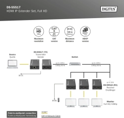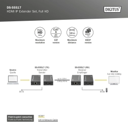 U načinu točka–točka prenosi HDMI signal preko kabela Cat 6 na udaljenost do 120 metara bez gubitka kvalitete slike i zvuka.
