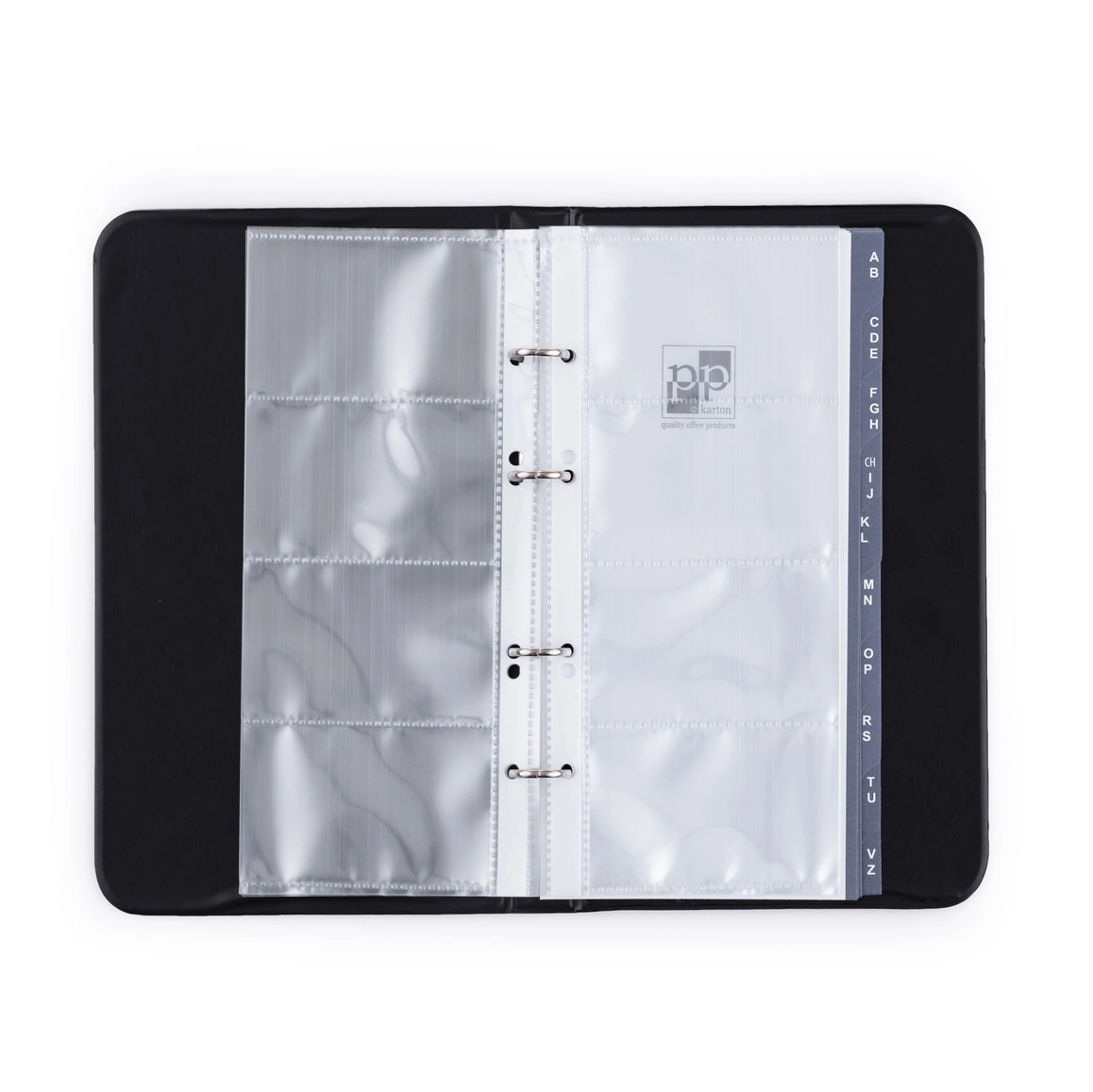 Održavajte svoje poslovne kontakte savršeno organiziranima. Ovaj viziatar s prstenastim mehanizmom omogućuje jednostavnu zamjenu i dopunjavanje listova, a prima do 80 standardnih posjetnica. Crna sjajna površina daje profesionalan izgled i otporna je na uobičajeno trošenje.