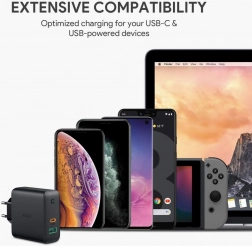 Punite brzo i učinkovito svoje uređaje s punjačem AUKEY PA-D3. Dva porta – USB-C Power Delivery i USB-A – pokrivaju sve od mobitela i slušalica do zahtjevnijih uređaja, uključujući prijenosna računala i monitore napajane putem USB‑C. Tehnologija Dynamic Detect inteligentno raspoređuje snagu: pri jednom priključenom uređaju do 60 W, a pri dvama uređajima optimizira raspodjelu (npr. do 45 W za primarni port), čime osigurava brzo i sigurno punjenje.