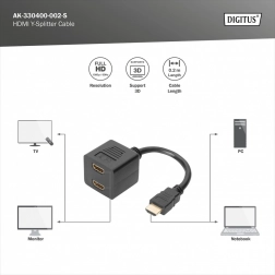 Pasyvni HDMI splitter je idealno rješenje za povezivanje dvaju televizora ili monitora na jedan HDMI priključak računala ili prijenosnog računala, uz podršku kvalitete Full HD (1080p). Nije moguće istovremeno korištenje oba uređaja.