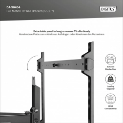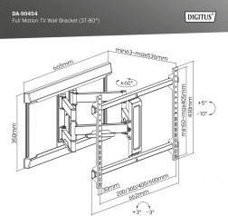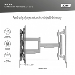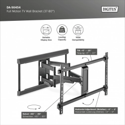 Nosač nudi izvlačnu ruku s rasponom od 6,3 do 53,6 cm, što omogućuje optimalno podešavanje kuta za idealno gledanje. Mogućnost okretanja u rasponu od +60 do -60° i nagib od +5 do -10° pružaju prilagodljivost prema potrebama korisnika. Horizontalna rotacija u rasponu od +3 do -3° osigurava precizno pozicioniranje zaslona.