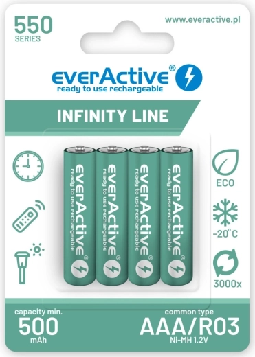Ove AAA (R03) punjive baterije kapaciteta 550 mAh isporučuju se unaprijed napunjene u tehnologiji ready to use, pa ih možete odmah umetnuti u uređaj. Linija Infinity Line dizajnirana je za dugotrajan rad u uređajima s umjerenom potrošnjom energije, pružajući pouzdan i održiv rad.