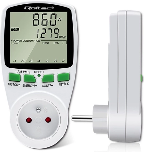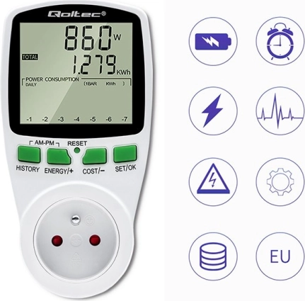 Pametni utični mjerač potrošnje energije Qoltec PM0627 pomaže vam smanjiti račune za struju zahvaljujući preciznom nadzoru. Nudi veliki pozadinski LCD, 7 načina prikaza, izračun troškova, povijest potrošnje i zaštitu od preopterećenja. Jednostavno priključite i odmah mjerite snagu, energiju i cijenu.